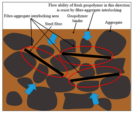 Flow of fresh reinforced geopolymer concrete is resisted by fiber-aggregate interlocking.