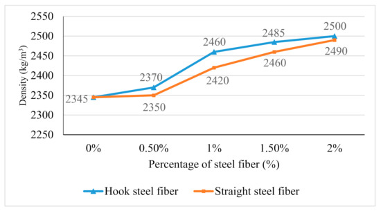 The density of a substance is measured as mass per unit volume. All the samples were measured after being cured for 28 days at room temperature by their mass and divided by the size of mold which is 100 mm × 100 mm × 100 mm. Figure 4 shows the graph comparison of density between hooked steel fiber and straight steel with different fibers addition.