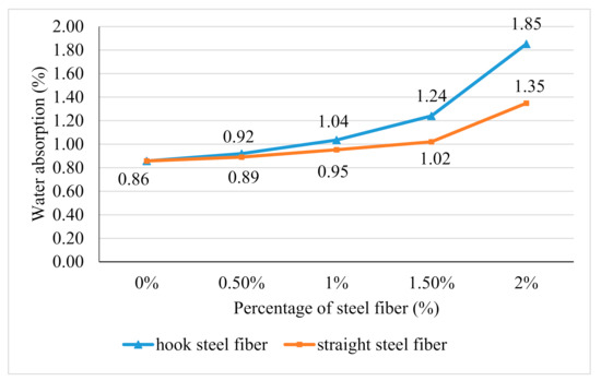 Water absorption of geopolymer concrete with the addition of hooked and straight steel fibers.