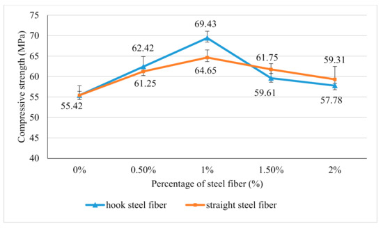 However, the compressive strength of geopolymer concrete decreases as the addition of the fibers exceeds 1.5%. This may be due to the poor workability of geopolymer concrete with the addition of steel fibers starting at 1.5%, which is around 31.5 mm and 35.88 mm for the inclusion of hook and straight steel fiber respectively.