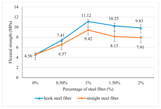 Besides, the addition of hooked steel fibers shows a higher flexural strength compared to the straight steel fibers at all percentage of steel fibers addition. This is due to the anchorage of hooked steel fibers, which provides extra loading capacities during the flexural test compared to the straight steel fibers. The anchorage of hooked end steel fibers increases the resistance and friction between the fibers and geopolymer matrix when a load is applied. This indicates that higher energy is required to slip out the hooked end steel fibers from the geopolymer matrix.