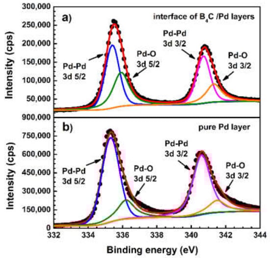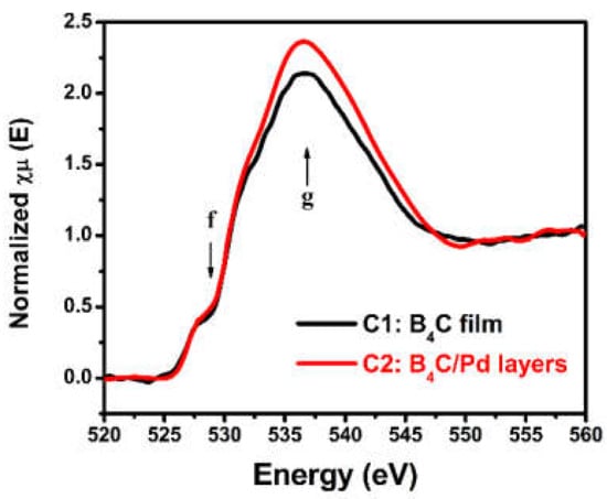 - First oxygen diffused into the film. Known from the previous calculation of density functional theory (DFT), O2 dissociation proceeds on a Pd layer with reaction barriers of 0.72 eV [26]. The energy of the reaction barriers decreases to 0.63 eV when B and Pd exist simultaneously [26], indicating B and Pd enhance the decomposition of O and promote the oxidation reaction. In our work, the most obvious structural change occurs in the B4C/Pd layers placed in a dry oxygen-rich environment. In this case, it is essential that numerous O2 will decompose into O with the participation of B and Pd.