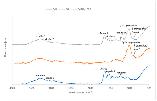 ATR-FTIR spectroscopy was performed to confirm β-glucan present in collagen film as well as to assess the interaction between those polymers. The results obtained for collagen, β-glucan powder, and Coll90/10BG are presented in Figure 1 and assignments of the major frequencies are shown in Table 1.