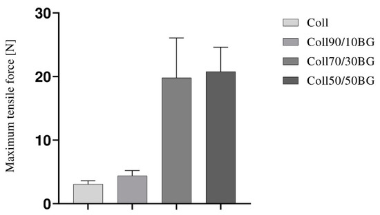 During mechanical testing of the samples, data on maximum tensile force at break were collected. The obtained results are presented in Figure 2.