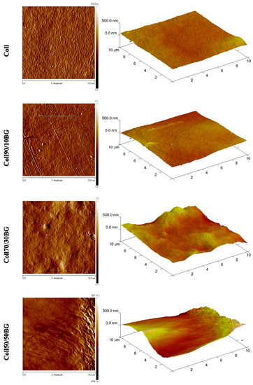 The morphology of Coll/BG materials was visualized using AFM analysis. Pictures in two- and three-dimensional (2D and 3D) form are presented in Figure 3. Additional information about the roughness of the prepared materials can be found in Table 2, where the Rq and Ra values are presented. Rq is a root mean square roughness and represents the standard deviation of the distribution of surface heights. Ra is an arithmetic average height parameter defined as the average absolute deviation of the roughness irregularities from the mean line over one sampling length [22].