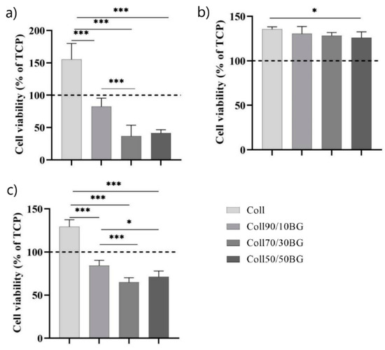 Viability of HaCaT cells (a) after 24 h direct culture on the materials, (b) after 24 h exposure to the material extracts, and (c) after 72 h direct culture on the materials that were “pre-conditioned” for 24 h with culture medium. * p ≤ 0.05; *** p ≤ 0.001.
