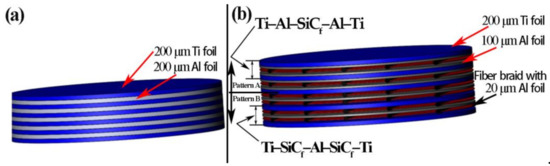Schematic illustration of the stacking sequence: (a) Ti–Al–Ti; (b) Pattern A: Ti–Al–SiCf–Al–Ti and Pattern B: Ti–SiCf–Al–SiCf–Ti.