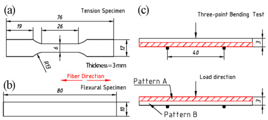 Schematic illustrations of the specimens (units: mm): (a) tensile specimen; (b) flexural specimen; (c) three-point bending test (Pattern A: Ti–Al-SiCf-Al-Ti; Pattern B: Ti-SiCf-Al-SiCf-Ti).