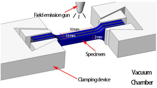 In situ tensile testing of specimen in SEM (MINI-MTS2000, Qiyue Technology Co., Ltd., Hangzhou, Zhejiang Province, China) was applied with a loading rate of 5 μm/s. In order to better observe the fracture and crack extension behavior of the SiCf-reinforced Ti/Ti–Al laminated composites, each surface was polished, especially the observation surface—i.e., the cross section of the specimen that is 10 mm in gauge length (Figure 6).