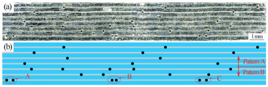 Figure 7a,b present the transverse section of the fabricated SiCf-reinforced Ti/Ti–Al laminated composite. The layers with dark colors are the titanium, while the layers with light color are the formed intermetallic, among which are the scattered SiC fibers (black dots). As described above, two different arrangements were designed in the preform: Ti–Al–SiCf–Al-Ti and Ti–SiCf–Al-SiCf–Ti. Figure 7b shows the structure illustration of the fabricated laminated composite. It can be found that the SiC fibers in Pattern A are almost at equal distances (5.0 ± 0.5 mm) along the laminate direction. This means that the fiber intervals can be guaranteed by using the fiber braid, as shown in Figure 2, while in Pattern B, two layers of fiber braid were placed between the Ti foils (Ti–SiCf–Al–SiCf–Ti). With the melt and reaction of Al foils, two layers of fiber braids were pressed together, resulting in SiC fiber aggregation.