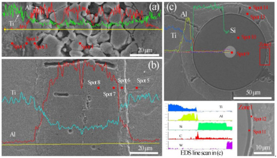 Figure 10c presents the interface of the SiC fiber and intermetallic matrix. An intact C coating can be found on the SiC fiber surface, which prevents the fiber damage in the laminated composites. Meanwhile, a clear thin gray layer (about 1 μm thick) was formed on the Ti–Al intermetallic side (Figure 10c). According to the results of the line scanning in Figure 10c and the point scanning in Table 3 (Spot 12), the reaction layer can be identified as TiC and Al4C3, as demonstrated in previous reports [4,12,20]. However, they were not detected in XRD (Figure 9) due to the low contents.