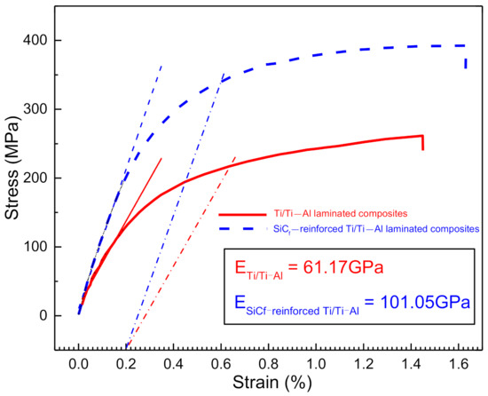 Figure 11 presents the stress–strain curves of Ti/Ti–Al and SiCf-reinforced Ti/Ti–Al laminated composites in room temperature uniaxial tension tests. The yielding strength at 0.2% deformation of the Ti/Ti–Al laminated composite is 217 MPa and the elastic modulus is 61.17 GPa. The yielding strength at 0.2% deformation and the elastic modulus of the SiCf-reinforced Ti/Ti–Al laminated composite are 339 MPa and 101.05 GPa, respectively. Comparing to the Ti/Ti–Al laminated composite (with the same volume fraction, 60%), the yielding strength at 0.2% deformation of SiCf-reinforced Ti/Ti–Al laminated composite increases by 122 MPa, while the elastic module increases by 65%. This means that by introducing the SiC fibers, both the tensile strength and the resistance to deformation of laminated composites are significantly improved. Meanwhile, the ultimate elongation of SiCf-reinforced Ti/Ti–Al laminate composites reaches 1.6%, which is about 14% higher than the Ti/Ti–Al laminate composites.