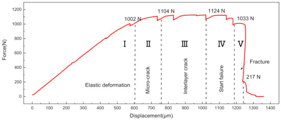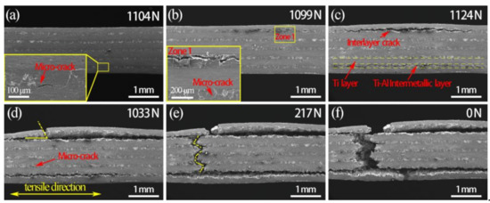 Figure 12 shows the force–displacement curves of SiCf-reinforced Ti/Ti–Al laminated composite obtained through in situ tensile testing. The curve consists of five stages: elastic deformation stage (I), yield stage (II), delamination stage (III), start failure stage (IV) and fracture stage (V). The entire failure process of in situ tensile testing was observed under SEM. Figure 13 describes the detailed deformation morphologies corresponding to different tension force values. Firstly, microcracks initiated in the Ti–Al intermetallic layer when the tensile load ranged from 1002 N to 1102 N, as shown in Figure 13a. As the load continued to increase, the microcracks propagated and merged in the Ti–Al intermetallic layers. Interlayer cracks appeared when the load reached 1109 N. The microcracks and interlayer cracks first appeared in the outer layer of the laminated composite, as shown in Figure 13a,b. When the load reached 1124 N, delamination occurred within the Ti–Al intermetallic layers (Figure 13c). Then the SiCf-reinforced Ti/Ti–Al laminated composite began to fail (Figure 13d). It can be observed that the outer layers failed first and then the inner layers (Figure 13e). Ultimately, the whole specimen fractured completely (Figure 13f).
