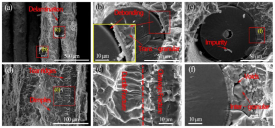 Fiber reinforcement consists of fiber pullout, fiber debonding and fiber fracture. In this experiment, it can be seen that fiber fracture was the main failure mode. Debonding of SiC fibers can also be observed at the interface between the fracture SiC fiber and the intermetallic matrix (Figure 15b). No pulling out failure mode was found at the fracture section, which can be ascribed to the high interface bonding strength. The excessive interface binding strength of the fibers with the matrix may limit the enhancement effect of fibers to some extent, consistent with the results in the literature [21,22]. There is no damage of the fibers in the tensile experiment (Figure 15c,f). Meanwhile, the interface between the Ti layer and the Ti–Al intermetallic layer was well integrated, which further verified that with the higher exerted pressure, more compact structures with fewer Kirkendall holes can be obtained. The conclusion can be drawn that with the introduction of the fibers, the fracture resistance of the SiCf-reinforced Ti/Ti–Al laminated composites further improves.
