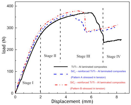Figure 16 presents the load–deflection curves for the three-point bending test of Ti/Ti–Al and SiCf-reinforced Ti/Ti–Al laminated composites. According to the results, load–deflection curves can be divided into four stages. At the beginning of loading (Stage I), the curves presented a linear increase. The flexural stiffness at this stage ranges from 87 to ~104 GPa, as calculated. When the value of load reaches about 350 N (Stage II), the prepared laminated composites start to fail. The flexural strengths of Ti/Ti–Al and SiCf-reinforced Ti/Ti–Al laminated composites are close to 900~950 MPa. It can be observed that the bending performance of laminated composites was only slightly improved due to the small amount of unidirectional SiC fibers introduced.