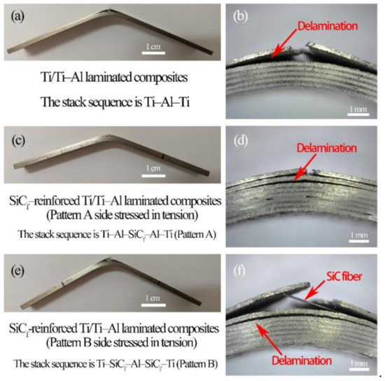 Figure 8e,f show the microstructures of SiCf-reinforced Ti/Ti–Al laminated composites corresponding to Pattern A and Pattern B, as depicted in Figure 3b. SiC fiber aggregation occurred on the Pattern B side. With small spacing between the SiC fibers, more cracks emerged (Figure 8f). This means that the “Ti–Al–SiCf–Al–Ti” laminated structure (Pattern A) should be preferred to obtain an equal spacing of the fiber arrangement.