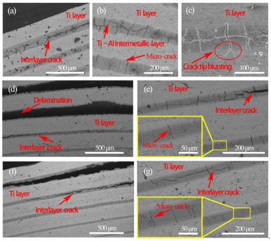 The crack morphologies of the prepared laminated composites in three-point bending test: (a–c) Ti/ Ti–Al Laminated Composite; (d–g) SiCf-reinforced Ti/ Ti–Al laminated composites, (d) and (e) Pattern A stressed in tension, (f) and (g) Pattern B stressed in tension.