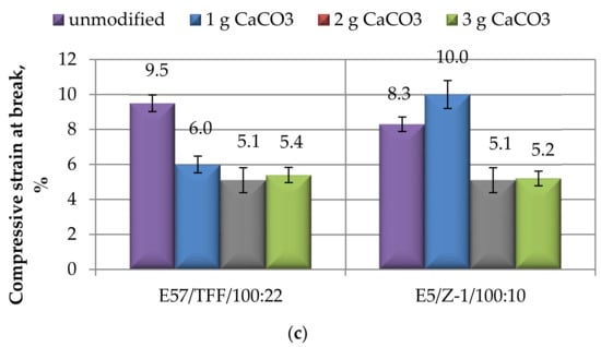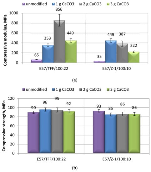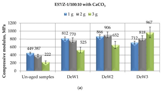 Similarly, the addition of calcium carbonate to the E57/Z-1/100:10 system led to noticeable increases in compressive modulus, ranging an order of magnitude with the addition of 1 or 2 g of filler (Figure 2a); in correspondence of a larger amount (3 g), the modulus is reduced, remaining still much greater than that measured on an unfilled system. Therefore, the positive effect on the compression modulus of CaCO3 addition to the epoxy resin under analysis is confirmed.