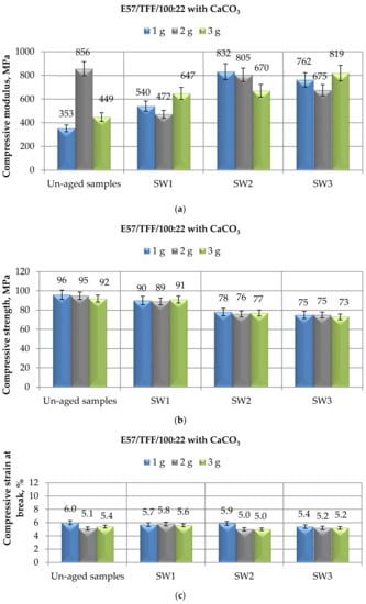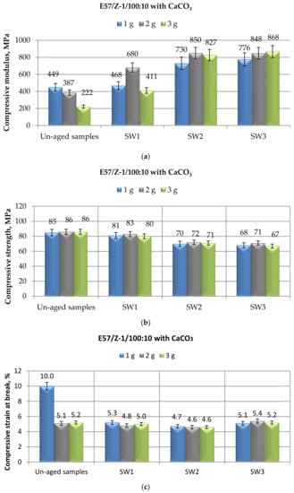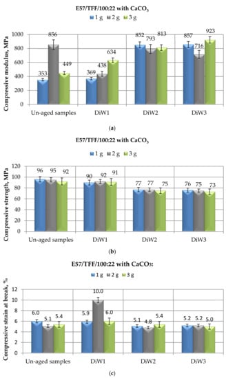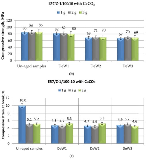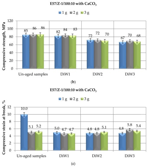 The compressive strain at break values measured on the CaCO3-filled E57/Z-1/100:10 systems after different periods of time in distilled water are presented in Figure 7c. This characteristic seemed to be almost unaffected by this aqueous exposure, as already observed in Figure 6c in the case of immersion in demineralized water. The same considerations previously reported for the behavior of E57/Z-1/100:10/1CaCO3 system can be here repeated.