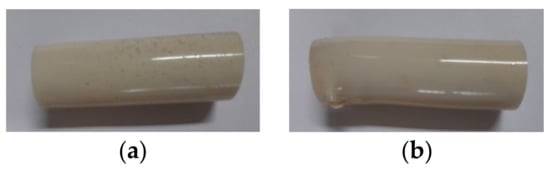 The detailed procedure to manufacture the CaCO3–epoxy systems can be found in a recently published paper []. After a curing time of 7 days at ambient temperature (i.e., 22 ± 1 °C, R.H. 24 ± 4%), the specimens possessing a cylindrical shape, compliant with PN-EN ISO 604-2006 code, were subjected to different tests, as described in the next paragraph. A single-stage 7-day curing time was employed, as suggested by suppliers and previously experienced in other studies [,,,,]. After this curing time at ambient temperature, a curing degree around 95% was measured. Furthermore, this is the polymerization time used on site to obtain an almost complete polymerization of the resin with an optimal development of the mechanical and adhesive properties. For each of the compositions reported in Table 3, 6 unaged specimens were tested, plus another 6 specimens for each of the 3 aging regimes (described next) and each of the 3 immersion times. In Figure 1, one of the produced cylindrical epoxy specimens is shown, along with its dimensions.