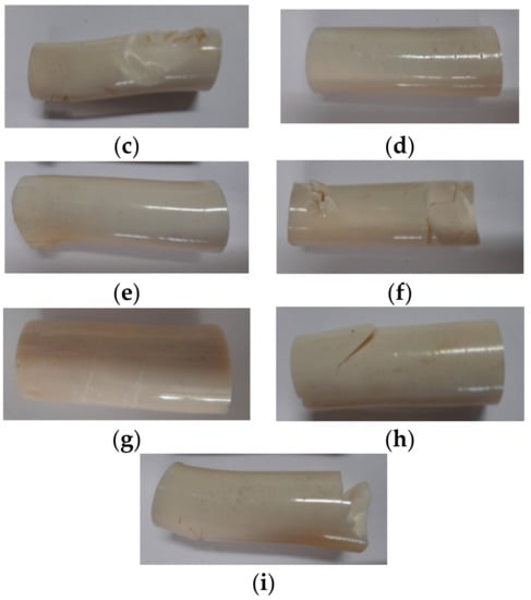 Images of some CaCO3-filled epoxy adhesives cold-cured by triethylenetetramine (TETA) curing agent (i.e., system E57/Z-1/100:10/1CaCO3) after mechanical (in compression mode) tests: (a) DeW1; (b) DeW2; (c) DeW3; (d) DiW1; (e) DiW2; (f) DiW3; (g) SW1; (h) SW2; (i) SW3.