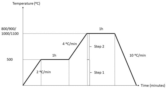 The homogenized mixture was poured into a mold. The alkali activator was prepared 24 h prior to use by mixing 8 M NaOH (Formosa Plastic Corporation, Taiwan) and sodium silicate (South Pacific Chemical Industries Sdn. Bhd., Petaling Jaya, Malaysia) with Na2SiO3 to NaOH ratio of 4:1. The slurry geopolymer was vibrated to remove trapped air and sealed with plastic at the exposed portion of the mold during the curing stage. Samples cured at room temperature for 24 h, followed by curing at 60 °C in the oven for 14 days. The cured samples were sintered with the heating profile shown in Figure 1. Step 1 was sintered to a lower temperature, 500 °C, with a heating rate of 2 °C/min. Higher temperature settings were applied in Step 2, ranging from 800, 900, 1000, and 1100 °C, with a heating rate of 4 °C/min. The soaking time was set to 1 h for each step. The cooling rate was 10 °C/min. The kaolin–GGBS geopolymer was sintered using a bench top muffle furnace. Two steps of sintering were applied in this method to purposely control the major cracking effect on the sintered samples.