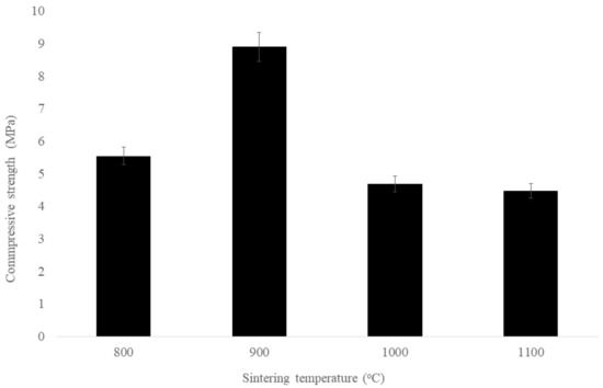 Figure 2 shows the compressive strength of sintered kaolin–GGBS geopolymer at different sintering temperatures. The heating rate, sintering temperature of T1, and soaking time were kept constant while the sintering temperature of T2 was 800, 900, 1000, or 1100 °C. The compressive strength firstly increased and then decreased with the increase in sintering temperature, reaching a maximal value of 9 MPa at 900 °C. Previous research reported the compressive strength of kaolin geopolymer after 24 h curing in 60 °C. However, the strength obtained was only 1 MPa [19].