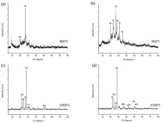 The phase transformation of sintered kaolin–GGBS geopolymer at different sintering temperatures (a) 800 °C, (b) 900 °C, (c) 1000 °C, and (d) 1100 °C.
