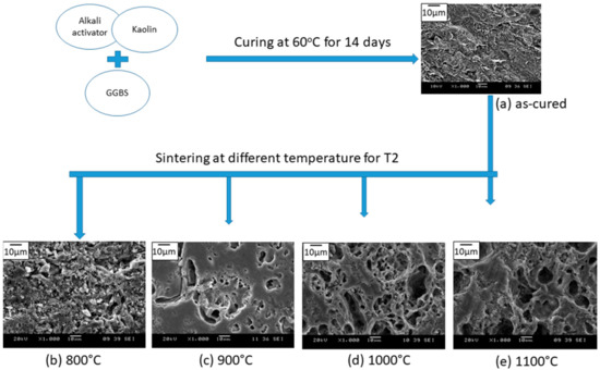 Microstructural evolution of sintered kaolin–GGBS geopolymer at different sintering temperatures with magnification 1000×: (a) as-cured, (b) 800 °C, (c) 900 °C, (d) 1000 °C, and (e) 1100 °C.