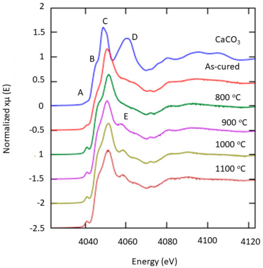 The Ca K-edge XANES spectra of the sintered kaolin–GGBS geopolymer with a different sintering temperature are presented in Figure 7. The spectra had a great absorption range from 4000 to 4200 eV. The sintered kaolin–GGBS geopolymer spectra were compared with the CaCO3 standard. From the XANES analysis, five XANES features, labelled from A to E, were visible as the energy increased. No significant changes were observed in the extended x-ray absorption fine structure, (EXAFS) region. The pre-edge peaks (labelled as A) increased as the sintering temperature increased. Conversely, the near-edge peaks (labelled as B) changed when the samples were sintered. The peak drastically increased compared with the as-cured sample as the sintering temperature increased, except at the 800 °C sintering temperature.