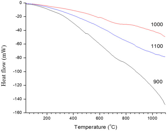 Differential scanning calorimetry (DSC) analysis was performed for three samples of sintered kaolin–GGBS geopolymer, which were 900, 1000, and 1100 °C as shown in Figure 8. The 800 °C sintered samples were excluded from this analysis due to the incomplete reaction based on the microstructure and phase transformation analysis. Generally, we observed that the DSC signals increased with rising sintering temperature. Neither exothermic nor endothermic peaks were observed for 900, 1000, or 1100 °C sintered kaolin–GGBS geopolymer. The slope of the DSC curve corresponds to thermal, physical, and chemical stability of the sintered samples when exposed to 1100 °C.