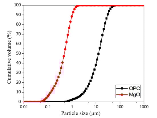 Particle size distributions of Ordinary Portland Cement (OPC) and magnesium oxide (MgO).