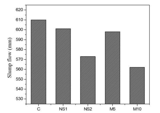 To evaluate the effects of NS and MgO on the workability of UWC concrete mixes, a slump flow test was conducted, as shown in Figure 2. The slump flow decreased with the addition of NS and its replacement with MgO. For example, slump values of 610 mm, 601 mm and 574 mm were measured for the control, NS1, and NS2 concrete mixes, respectively, mainly due to the large specific surface area of the NS powder. The fine particles of NS in the cement matrix had the strongest effect on the total water demand of the concrete mixes []. Therefore, the finer the particle powder added, the less workable the UWC. In addition, the incorporation of MgO in the UWC concrete mixes reduced the slump flow value. For instance, slump flow values of 610 mm, 598 mm, and 562 mm were measured for the control, M5, and M10 specimens, respectively. The decrease in fluidity with MgO was similar to the results of a previous study []. Finer MgO particles enhanced the cohesiveness of the cement paste, which reduced the fluidity. Furthermore, Zhang et al. [] reported that the incorporation of reactive MgO decreased the workability of a cement composite, which increased its water demand to achieve a similar flow value.