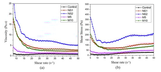 Figure 3 shows the rheological properties of the UWC mixes with different amounts of NS and MgO. Figure 3a shows the relationship between viscosity and shear rate, and Figure 3b shows the shear stress versus shear rate flow curves for the UWC mixes. Figure 3a illustrates that the enhancement of the shear rate decreased the viscosity. The addition of NS and replacement OPC with MgO increased the viscosity compared to that of the control specimens. Among the five UWC mixes, that to which 2% NS was added showed significant viscosity enhancement, followed by the NS1, M5, M10, and control specimens. Figure 3b shows that the shear stress increased when shear rate increased. In the region with a low shear rate of approximately 10 s−1, the shear stress was significantly reduced, probably because of destruction of the flocculated structures due to rotor rotation []. The shear stress results are similar to the viscosity values. As the amounts of NS and MgO increased from 1% to 2%, the shear stress improved compared to that of the control specimen. However, NS enhanced the viscosity more significantly than MgO. The higher UWC viscosity values could be attributed to the finer particle sizes with higher specific surface areas of NS and MgO, which required more water to achieve flow []. As NS has a much smaller particle size than MgO, its viscosity enhancement effect was greater.