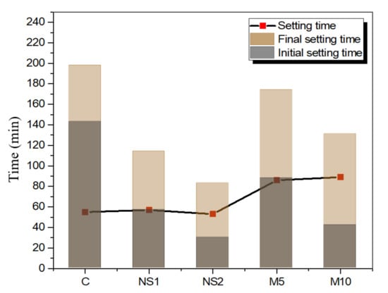 The initial setting time, the final setting time, and the setting time that is the duration between the initial and final setting times of the UWC pastes with different NS and MgO contents, are illustrated in Figure 4. Both NS and MgO incorporation into the UWC mixes reduced the initial and final setting times compared to the control specimen. When NS was increased from 1% to 2% and when MgO was increased from 5% to 10%, the initial setting time decreased by 60.1%, 79%, 38.46%, and 70.63%, respectively, and the final setting time decreased by 42.42%, 58.1%, 12.1%, and 33.84% compared to the control specimen. The results showed that the setting time decreased as the NS and MgO contents increased. However, NS reduced the setting time more significantly than did MgO. The reduction in the setting times of the UWC mixes that contained NS and MgO might be related to the finer particle sizes and higher surface areas of NS and MgO. Zhang et al. [] found that NS decreased the setting time by reducing the dormant period and enhancing cement hydration. Li et al. [] reported that the addition of NS promoted the gelation of C–S–H gels, which reduced their setting time. However, for MgO, the initial setting time decreased, and the setting time improved, compared to that of the control specimen. This was due to the fine particle size and hydration properties of MgO. The finer particle size of MgO compared to that of OPC gives it a larger surface area and a higher water demand, which shortens the initial setting time. The delay in final setting time could have been due to Mg(OH)2 formation during MgO hydration. Polat et al. [] found that Mg(OH)2 formation slowed the hydration process and delayed the setting time by encircling the cement particles.
