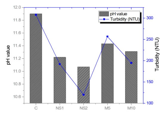To evaluate the anti-washout resistance of the UWC concrete mixes, pH measurements and a turbidity test were conducted. Figure 5 shows the pH and turbidity values of each of the mixes. UWC generally loses quality during on-site construction because cement materials are washed off and diluted by water flow []. If segregation and washout occur while the concrete mixes are poured, the overall pH and turbidity of the cement particles with a high pH value increase in the water. The high pH and turbidity values of UWC concrete mixes signify their washout resistance ability. As in Figure 5, all the mixes showed similar tendencies in terms of pH and turbidity values. The results indicate that the addition of NS powder reduces the pH and turbidity values of UWC mixes. For example, pH values of 11.9, 11.22, and 11.07, and turbidity values of 307.5 NTU, 192 NTU, and 120 NTU, were reported in the control, NS1, and NS2 specimens, respectively. This can be attributed to the reduced segregation of the UWC concrete mixes by the fine particles of NS because of their cohesive effect, as mentioned above. Senff et al. [] reported that the incorporation of NS can reduce the diameter of the spread on the flow table due to increased cohesiveness. For MgO replacement, pH values of 11.9, 11.63, and 11.31 and turbidity values of 307.5 NTU, 256.5 NTU, and 194.5 NTU were measured in the control, M5, and M10 specimens, respectively. The results showed that pH and turbidity decreased with increased MgO replacement. The increase in the anti-washout resistance of the UWC that contained MgO presumably occurred because the fine particles of MgO increased the cohesion of the concrete mixes. Both NS and MgO increased the cohesion of the UWC mixes due to their finer particle sizes compared to that of OPC, which enhanced the anti-washout resistance of the UWC.