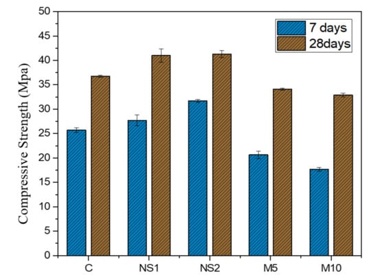 To investigate the effects of NS and MgO on the mechanical properties of the UWC concrete, a compressive strength test was conducted after 7 days and 28 days of curing. The results are shown in Figure 6, whereby the compressive strength increased with curing age in all mixes. This is because the continued hydration of cementitious materials increases the compressive strength. The 28-day compressive strengths attained for C, NS1, NS2, M5, and M10 were 36.73 MPa, 40.9 MPa, 41.27 MPa, 34.11 MPa, and 32.88 MPa, respectively. After 7 days and 28 days, the compressive strength of the concrete that contained NS was slightly higher than that of the concrete without NS. This strength development with NS was due to the fine particles and high pozzolanic activity of NS, which provide extra nucleation sites to cement particles, accelerate their hydration, and generate additional hydration products. Yu et al. [] found that the application of nanoparticles can increase the physical and mechanical properties of concrete by refining its microstructure. In addition, Scrivener et al. [] and Xu et al. [] mentioned that nanoparticles can accelerate the hydration process, densify the microstructure, and improve the Interfacial Transition Zone (ITZ) of concrete, which decreases the porosity and enhances the compressive strength of a cement composite. However, the incorporation of MgO into UWC reduces the compressive strength of UWC after 7 days and 28 days, compared to that of the control specimen. As the MgO proportion increased from 0% to 10%, the compressive strength of M5 and M10 decreased by 7.13% and 10.48%, respectively, after 28 days of curing, compared to the control specimen. This is because the amorphous active silica in MgO can react with MgO or Mg(OH)2 and water during the hydration process [,]. Unluer et al. [] reported that MgO reduced the compressive strength of cement due to the formation of brucite, which is weaker than C–S–H, in normal cement hydration.