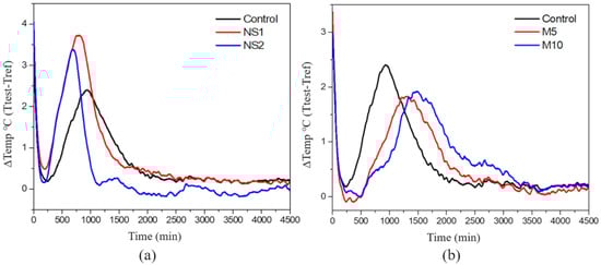 The first sharp peak was produced from the dissolution of the dry mixtures, and occurred immediately after the mixtures were mixed []. The second peak was generated between 500 and 2000 min and was related to the polymerization degree of the binder materials []. Figure 7a shows that the incorporation of NS into the UWC specimens accelerated the peak time and increased the peak temperature variation. Peak times of 940 min, 784 min, and 696 min were reported for the control, NS1, and NS2 specimens, respectively. In addition, the control, NS1, and NS2 specimens showed temperature variations of 2.4 °C, 3.73 °C, and 3.38 °C, respectively. This effect was mainly due to the seeding effect of nano-materials. Moreover, the acceleration effect of NS particles on cement hydration was due to the additional nucleation of C–S–H caused by the increased surface area of the nano-particles [,]. However, NS1 showed higher temperature variation compared to NS2. This phenomenon might be due to the dispersion of NS particles in the cement composite. The usage of more than adequate amounts of NS is considered to reduce efficiency due to the dispersion problem []. Figure 7b shows the effect of MgO content on the heat release of UWC specimens. When the amount of MgO increased, the peak time tended to be delayed, and the peak temperature was lower than that of the specimens without MgO. Although MgO has a smaller particle size than OPC, the UWC specimens that contained MgO showed lower hydration rates and heat release due to the lower reactivity of MgO. Mehta et al. [] reported that the MgO within cement slightly delayed hydration by producing magnesium hydroxide, which is insoluble.