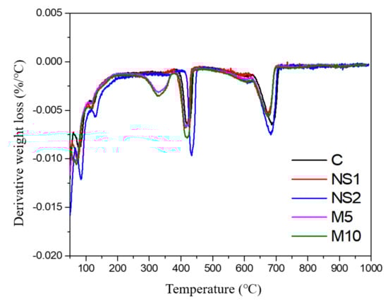 Figure 8 shows the Derivative Thermo Gravimetry (DTG) curves of the UWC mixes with different amounts of NS and MgO after 28 days of curing. All the UWC mixes showed mass loss peaks in four temperature regions. The mass loss below 15 °C is attributed to the evaporation of free water from the pore structure [,]. Lothenbach et al. [] found that mass losses between 50 and 200 °C were caused by the dehydration of C–S–H, and the secondary peaks at around 146 °C were associated with the decomposition of ettringite. Bernal et al. [] and Rozov et al. [] reported that the mass losses between 250 and 400 °C were related to the thermal decomposition of hydrotalcite. In the present study, no carbonate source was used, so the mass loss in this region was mainly due to the dehydroxylation of hydrotalcite []. In addition, the C–H groups at around 420 °C and between 660 and 700 °C were associated with the decarbonation of CaCO3. However, this carbonate region can be generated through powder manufacturing []. The results showed that increasing the NS content increased the mass loss when below 200 °C, as seen on the DTG curve of the UWC mixes. For specimens with and without NS, the type of hydration products remained unchanged. Only M5 and M10, which contained MgO, showed significant mass losses between 250 and 400 °C, which indicated the presence of hydrotalcite in the UWC with MgO.