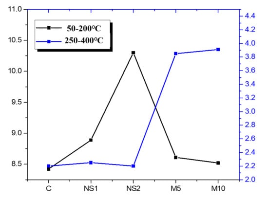 Figure 9 shows that the mass loss fractions contributed to the C–S–H (50–200 °C) and the hydrotalcite (250–400 °C) of the UWC mixtures as functions of NS and MgO. In the 50 to 200 °C region, the specimens that contained NS had higher mass loss than the control specimens. For example, mass loss fractions of 8.4%, 8.9%, and 10.3% were noted in the control, NS1, and NS2 specimens, respectively. The increase in the C–S–H gel is attributed to the promotion of cement hydration by NS due to its pozzolanic activity and nucleation effect []. In addition, in the 250 to 400 °C region, the specimens that contained MgO showed enhanced mass loss fractions, which led to higher amounts of hydrotalcite. A similar phenomenon was reported in a previous study. Yoon et al. [] found that, when MgO was incorporated in a cement composite, the MgO combined with Al and promoted the generation of the hydrotalcite phase in the cement composite.