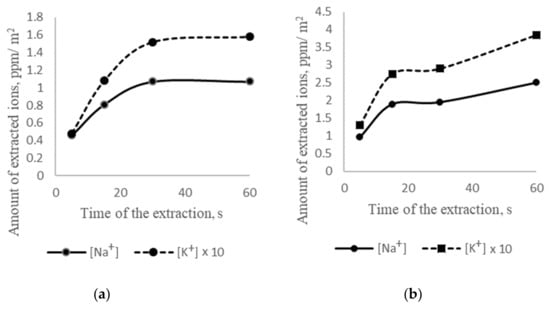 According to Figure 2a, it can be argued that at 295 K, the amount of extracted cations increased with the exposure from 5 to 30 s and further stabilized. Thus, the exposure time of 30 s may be considered the optimal exposure time. The number of extracted potassium cations was 15 times higher than that of extracted sodium cations, as in cement powder. At 368 K, the extraction process was two times faster than that at 295 K. The stabilization process occurred after 15 s; however, after 30 s, the amount of extracted cations increased again (Figure 2b).