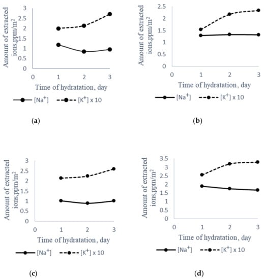 The extraction process with electromagnetic radiation made it possible to almost double the number of extracted cations without increasing the extractant’s temperature. Considering that the structural matrix of cement stone changes during the period of hydration, we aimed to determine the influence of such structural changes on the alkaline extraction process from mortar cement without additives and from mortars cement with glass powders having different alkaline contents and silica fume (Figure 3).