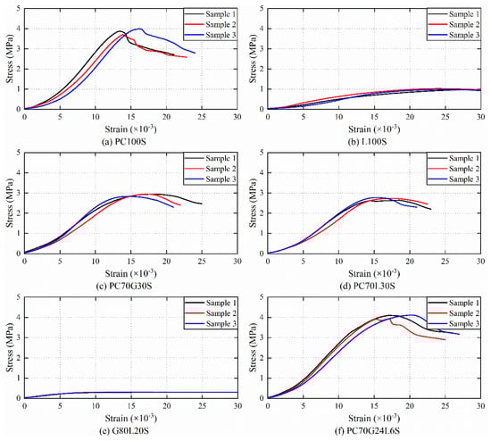 Since G100S failed to form after 28 days of curing, there was no compressive strength data. The stress–strain curves of the other six groups of stabilized soil samples are shown in Figure 1.