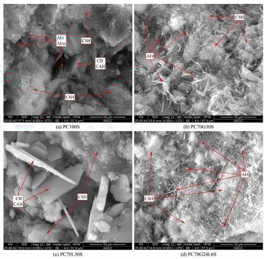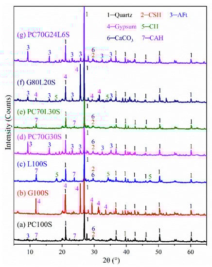 Furthermore, for PC70G30S (Figure 4d) [12] and PC70G24L6S (Figure 4g), there were very strong AFt crystal peaks, and weak CSH gel peaks and CaCO3 peaks. According to the XRD results alone, there is little difference between PC70G30S and PC70G24L6S. Therefore, a comprehensive analysis combining with XRD and SEM is in need.