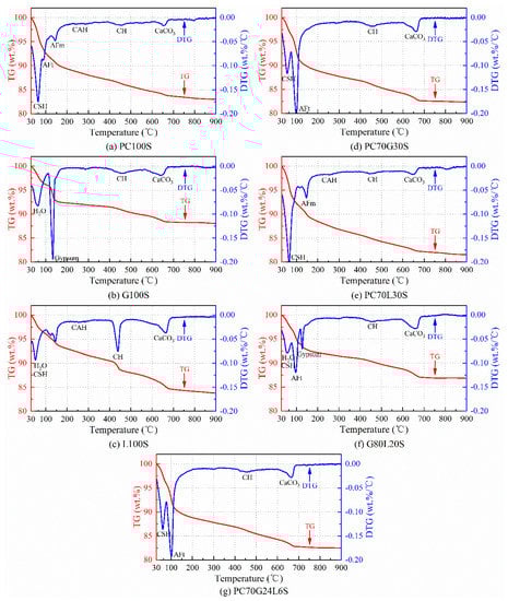 Furthermore, for PC70G30S (Figure 5d) and PC70G24L6 (Figure 5g), a slightly strong peak of pore adsorption water in CSH gels occurred at around 57 °C, and a very sharp peak of crystal water for AFt crystals occurred at 97 °C without the peak of crystal water for AFm crystals being observed. From the results of TG–DTG, there is little difference between PC70G30S and PC70G24L6. However, the peak value of pore adsorption water in CSH gels of PC70G24L6 was slightly larger than that of PC70G30S and smaller than that of PC100S, whereas the peak value of crystal water for AFt crystals of PC70G24L6 was slightly smaller than that of PC70G30S and obviously larger than that of PC100S.