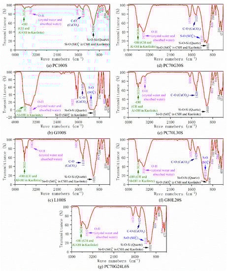As for PC70G30S (Figure 6d), G80L20S (Figure 6f), and PC70G24L6S (Figure 6g), there are strong absorption bands of S–O (1111 cm−1 and 594 cm−1) in SO42− ion, O–H (3427 cm−1 and 1676 cm−1) in crystal water and pore absorbed water, –OH (3636 cm−1) in CH, and CO32− ion (1425 cm−1 and 876 cm−1) in CaCO3. From the results of FTIR alone, there is little difference between PC70G30S, G80L20S, and PC70G24L6; therefore, it is necessary to combine SEM, TG–DTG, and XRD for analysis.