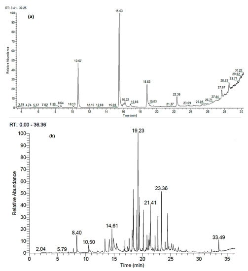 Gas chromatography–mass spectrometry (GC-MS) separation chromatograms for the essential oils from aerial parts of (a) M. longifolia and (b) C. reticulata. R.T. (Retention time, min).