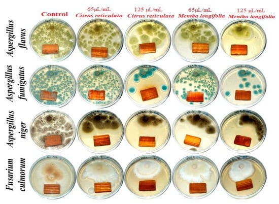 The following are available online at https://www.mdpi.com/1996-1944/14/6/1361/s1, Figure S1: Visual observation of Aspergillus flavus growth inhibition as affected by the EOs from (A) Mentha longifolia; (B) Citrus reticulata; (P) Positive control (Sertaconazol 3 g/L); (N) Negative control (DMSO 10%), Figure S2: Visual observation of Aspergillus niger growth inhibition as affected by the EOs from (A) Mentha longifolia; (B) Citrus reticulata; (P) Positive control (Sertaconazol 3 g/L); (N) Negative control (DMSO 10%), Figure S3: Visual observation of Aspergillus fumigatus growth inhibition as affected by the EOs from (A) Mentha longifolia; (B) Citrus reticulata; (P) Positive control (Sertaconazol 3 g/L); (N) Negative control (DMSO 10%), Figure S4: Visual observation of Fusarium culmorum growth inhibition as affected by the EOs from (A) Mentha longifolia; (B) Citrus reticulata; (P) Positive control (Sertaconazol 3 g/L); (N) Negative control (DMSO 10%).