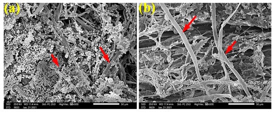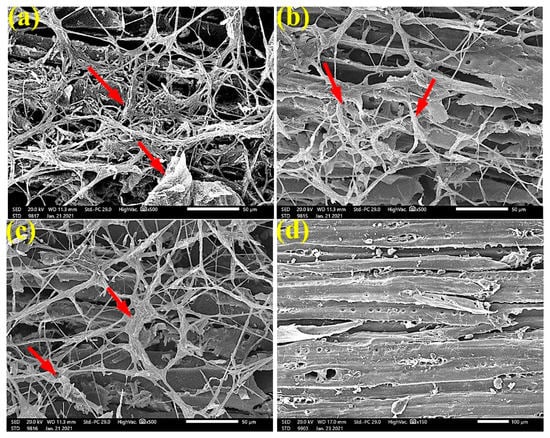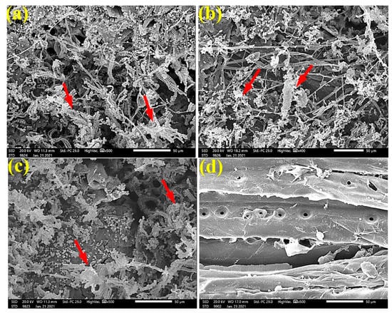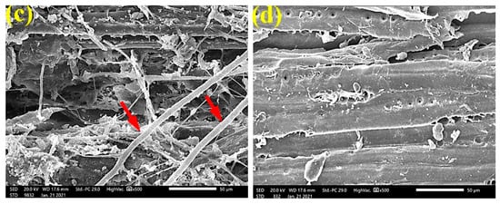 SEM images of P. roxburghii wood samples inoculated with F. culmorum: (a,b) without treatment; (c) with 65 µL/mL C. reticulata EO; (d) with 125 µL/mL C. reticulata EO. Arrows refer to the growth of fungal mycelia in wood samples, according to treatment.