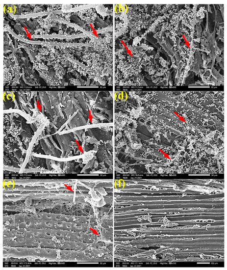 SEM images of P. roxburghii wood samples inoculated with A. flavus: (a) without treatment; (b) with 125 µL/mL C. reticulata EO; (c) with 65 µL/mL M. longifolia EO; (d) with 125 µL/mL M. longifolia EO; (e) with 65 µL/mL M. longifolia EO; (f) with 125 µL/mL M. longifolia EO. Arrows refer to the dense growth of fungal mycelia in wood samples, according to treatment.